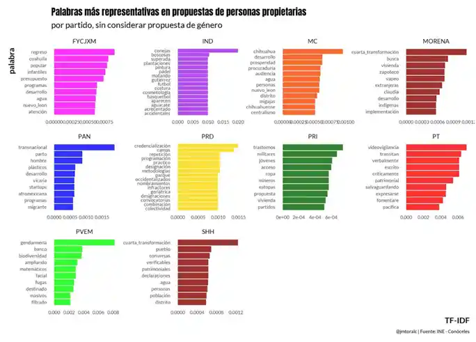 La siguiente figura muestran las palabras más representativas en las propuestas de las personas candidatas por partido político, sin considerar las propuestas de género. En Fuerza y Corazón por México (FYCJXM), destacan términos sobre el regreso de programas como estancias infantiles o el seguro popular. Las candidaturas independientes (IND) resaltan una serie de términos específicos como "conejas", "boscosas", "superada", "plantaciones", "pintura", "padel", "matando", "gutiérrez", "futuro", y "costura". Movimiento Ciudadano (MC) utiliza términos como "chihuahua", "desarrollo", "prosperidad", "procuraduría", "audiencia", "agua", "personas", "nuevo_leon", "distrito", y "migajas", mientras que MORENA incluye palabras como "cuarta_transformación", "busca", "vivienda", "zapoteco", "vapeo", "extranjeras", "claudia", "desarrollo", "indigenas", y "implementación". Por su parte, el Partido Acción Nacional (PAN) menciona términos como "transnacional", "parto", "hombre", "plásticos", "desarrollo", "vicaria", "startups", "afromexicana", "programas", y "migrante". El Partido de la Revolución Democrática (PRD) se enfoca en palabras como "credencialización", "camas", "reelección", "programación", "práctico", "diseñación", "metodología", "parque", "occidentalizados", y "nombramientos". El Partido Revolucionario Institucional (PRI) resalta términos como "trastornos", "militares", "jóvenes", "acceso", "ropa", "mineros", "estopas", "propuesta", "vivienda", y "partidos". En el Partido del Trabajo (PT), destacan "videovigilancia", "transtan", "verbalmente", "escrito", "críticamente", "patrimonial", "salvaguardando", "expresarse", "fomentar", y "pacifica". El Partido Verde Ecologista de México (PVEM) incluye términos como "gendarmería", "banco", "biodiversidad", "ampliando", "matemáticos", "facial", "fugas", "destinado", "masivos", y "filtrado". Finalmente, la coalición Sigamos Haciendo Historia (SHH) presenta palabras como "cuarta transformación", "pueblo", "conversas", "verificables", "patrimoniales", "declaraciones", "agua", "personas", "población", y "distrito". Estas palabras son meros conceptos aislados que requieren ser puestos en contexto; no obstante, resulta interesante observar este mapa y tener una percepción de las prioridades de los partidos.