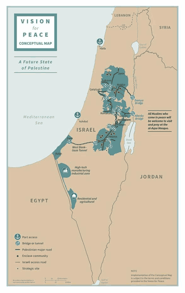 El enfoque de esta propuesta de paz recicla las estrategias fallidas del pasado, al colocar a los palestinos en un período de prueba para demostrar que pueden ser considerados como un Estado, utilizando condiciones maleables, mal definidas, y prácticamente imposibles de lograr; y al buscar inducir la rendición palestina por medio de la generosidad económica, lo cual esencialmente elimina la responsabilidad de cualquier concesión israelí hasta que los palestinos declaren su rendición total.
