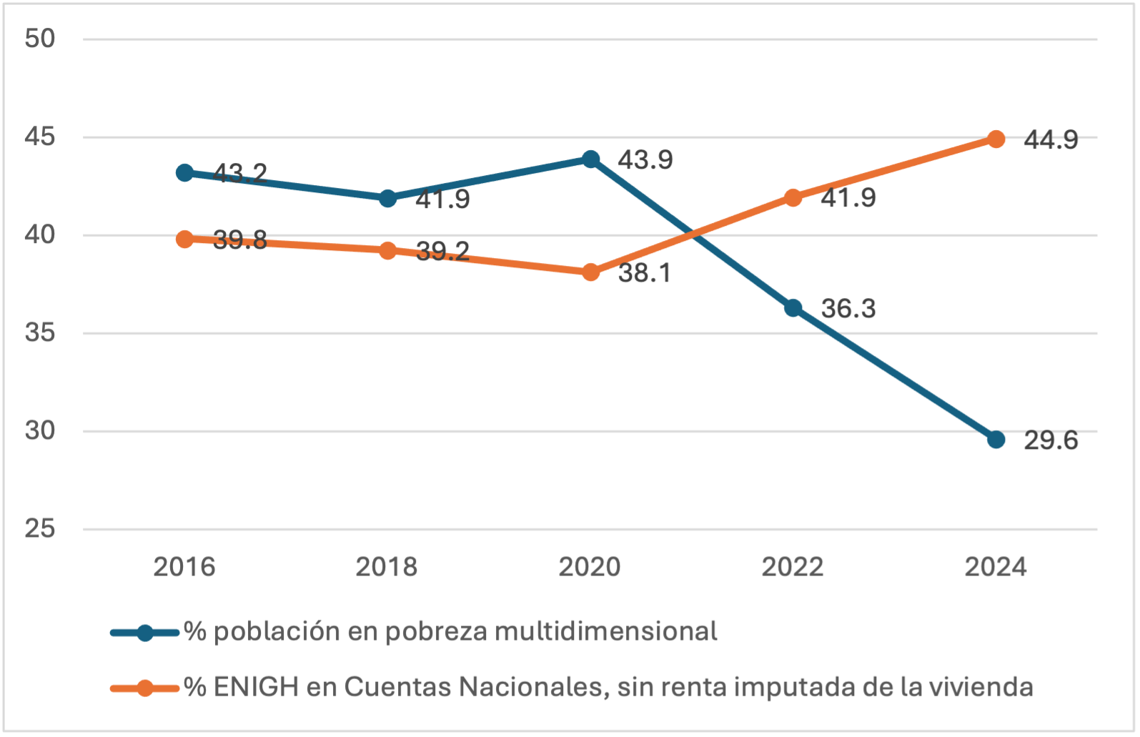 Esquivel menciona que este grupo ha encontrado un nuevo argumento “que parece darles la razón” que es el que di a conocer en mi artículo “La doble vida del ingreso y la pobreza en México” en el que reporto evidencia derivada en su totalidad de datos del Inegi que muestran cómo la cobertura del ingreso de los hogares de la ENIGH respecto del de las Cuentas Nacionales, luego de haberse mantenido relativamente estable en 2016, 2018 y 2020, se amplió en 2022 y luego volvió a hacerlo en 2024; lo que coincidió con las importantes disminuciones en la pobreza multidimensional y por ingresos que a partir de la ENIGH se registró en esos años. Ver Gráfica 1.