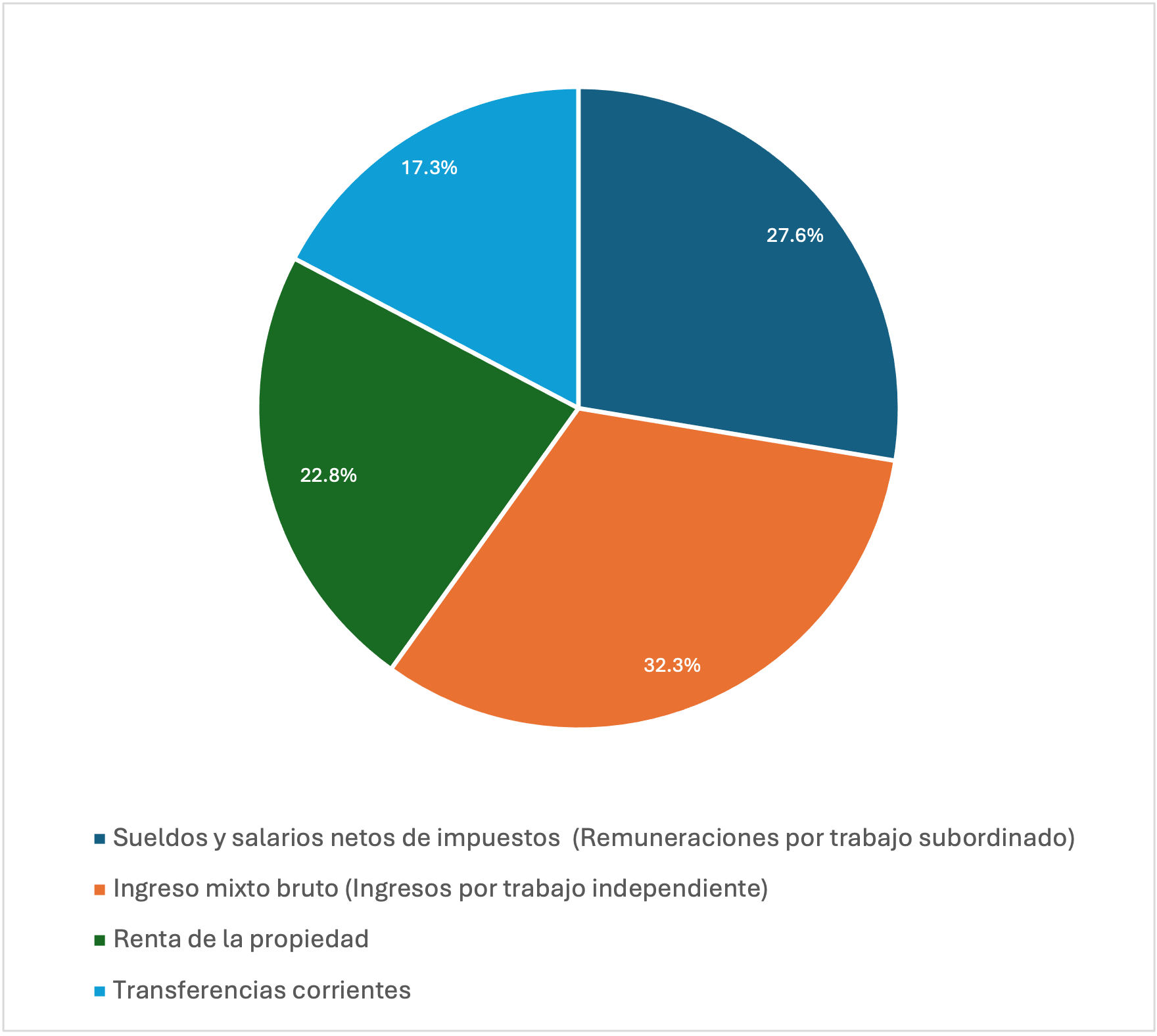 Gráfica 2. Estructura porcentual por fuentes del ingreso corriente de los hogares (sin alquiler imputado de la vivienda), promedio 2016-2024.