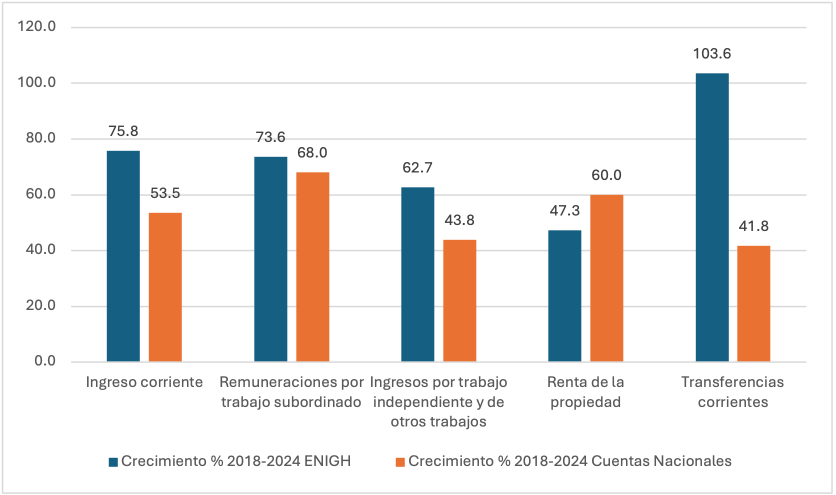 De ello resulta un ingreso de los hogares que es 240 % más grande que el reportado por la ENIGH y que de 2018 a 2024 crece (sin considerar el alquiler imputado de la vivienda) bastante menos rápido (8.1 %) que el de la encuesta (23.8 %). El ingreso de la ENIGH omite los ingresos de las personas más ricas del país, por lo que está truncada en la parte alta de la distribución, y además refleja lo que las personas entrevistadas recuerdan o están dispuestas a revelar, por lo que suele quedarse muy corto respecto de lo que se registra en otras fuentes; mientras que la CSIH resulta de manera orgánica como parte del Sistema de Cuentas Nacionales, por lo que es mucho más verosímil.