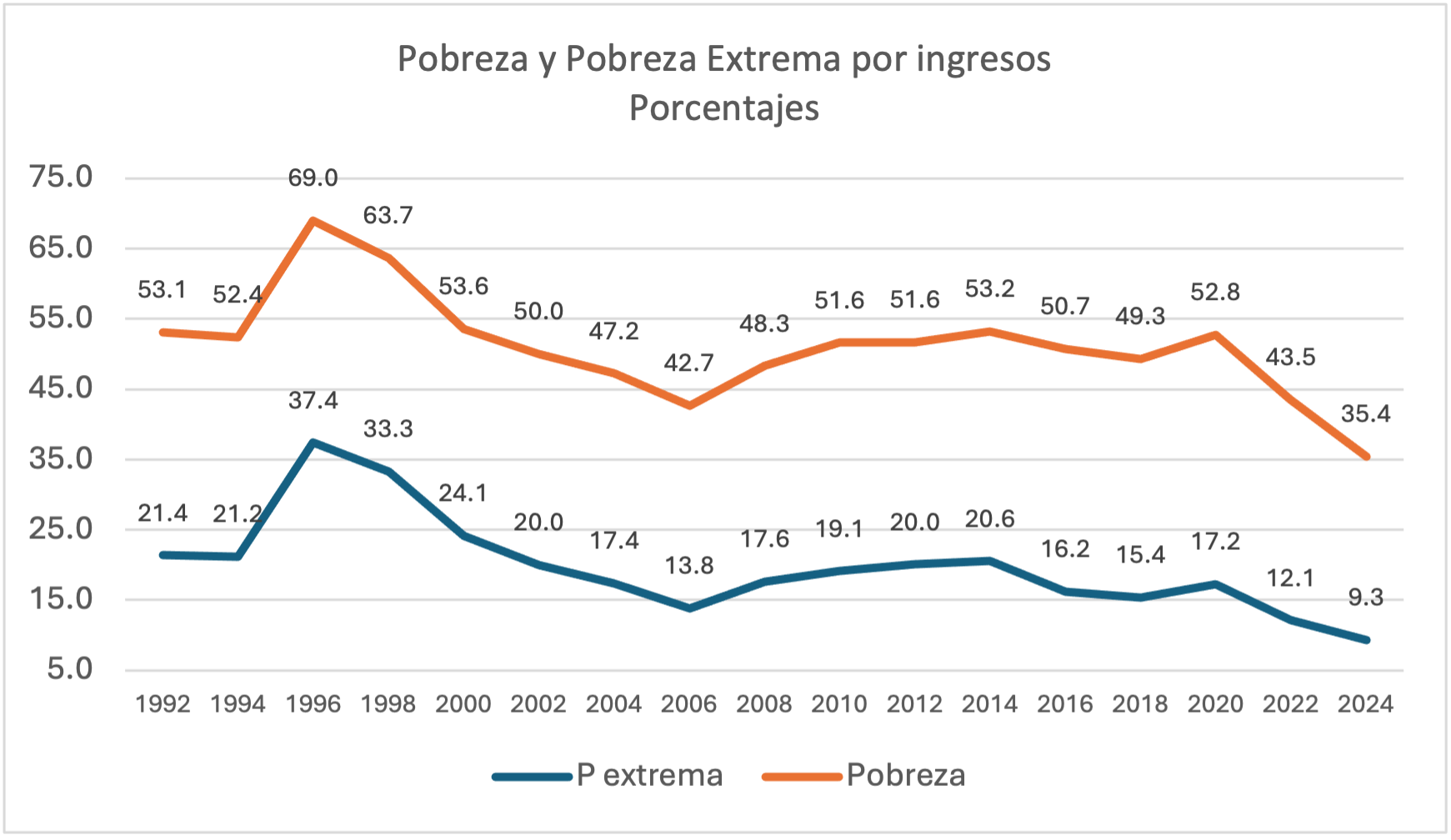 Gráfica 1. Pobreza y pobreza extrema por ingresos 1992-2024 (%)