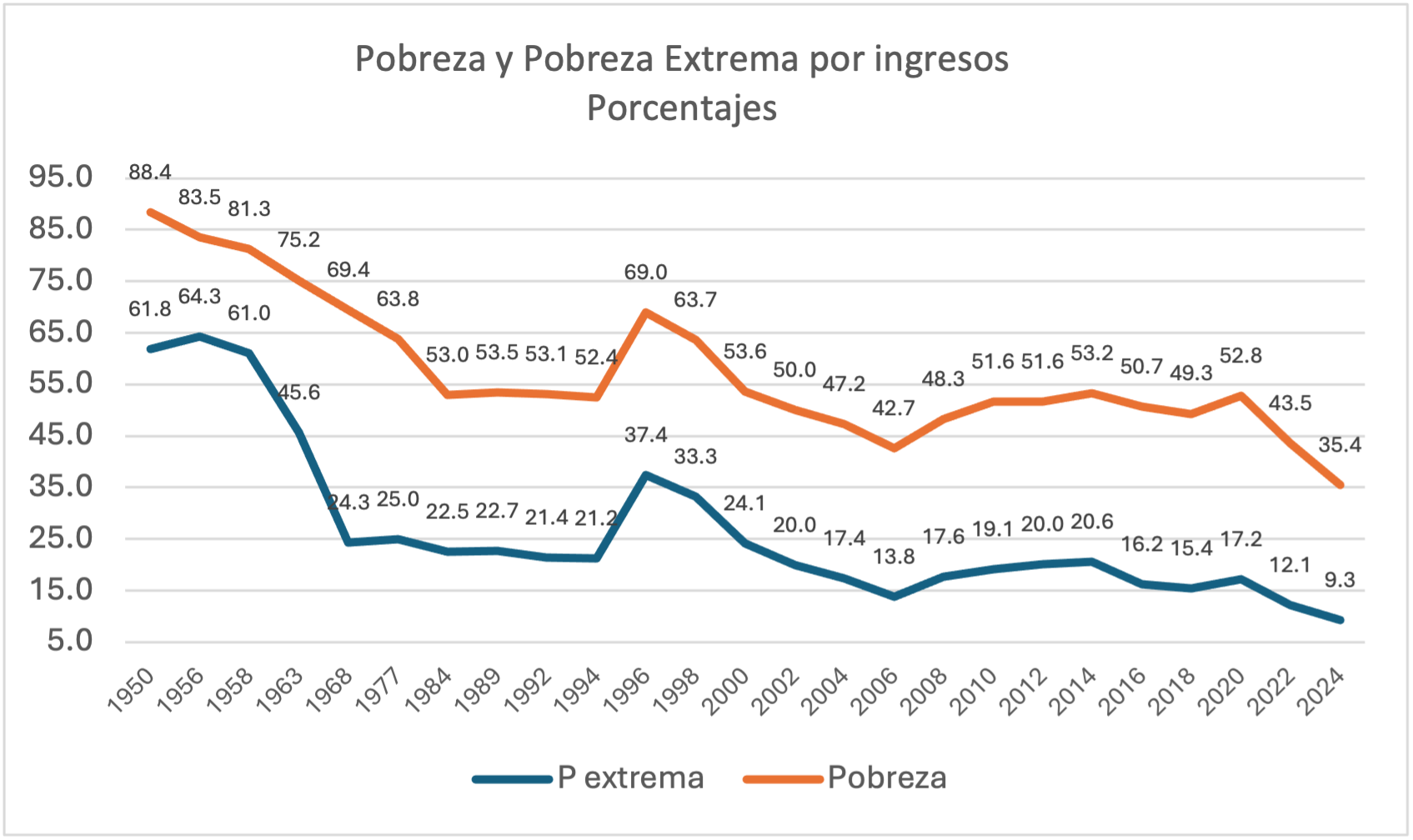 Gráfica 2. Pobreza y Pobreza Extrema por ingresos 1950-2024 (%)