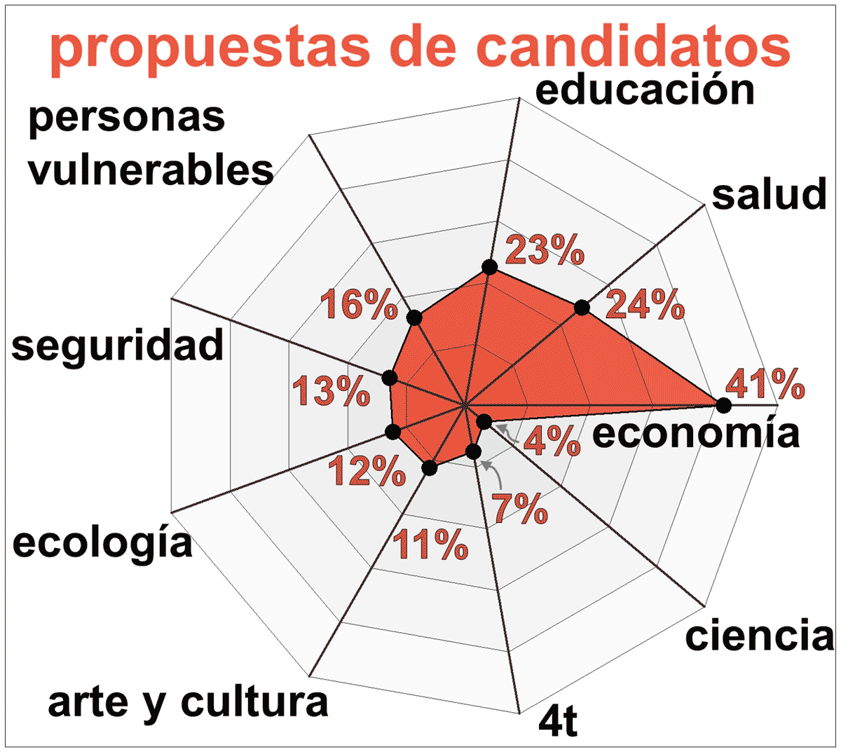 Casi la mitad de las propuestas hablan de alguna u otra manera del empleo y de la economía. Por los estragos de la pandemia, una de cada cuatro propuestas habla de salud. La educación es también uno de los temas más mencionados en las propuestas, mientras que pocos aspirantes hablan de ecología, de sustentabilidad, o de ciencia, arte o cultura.