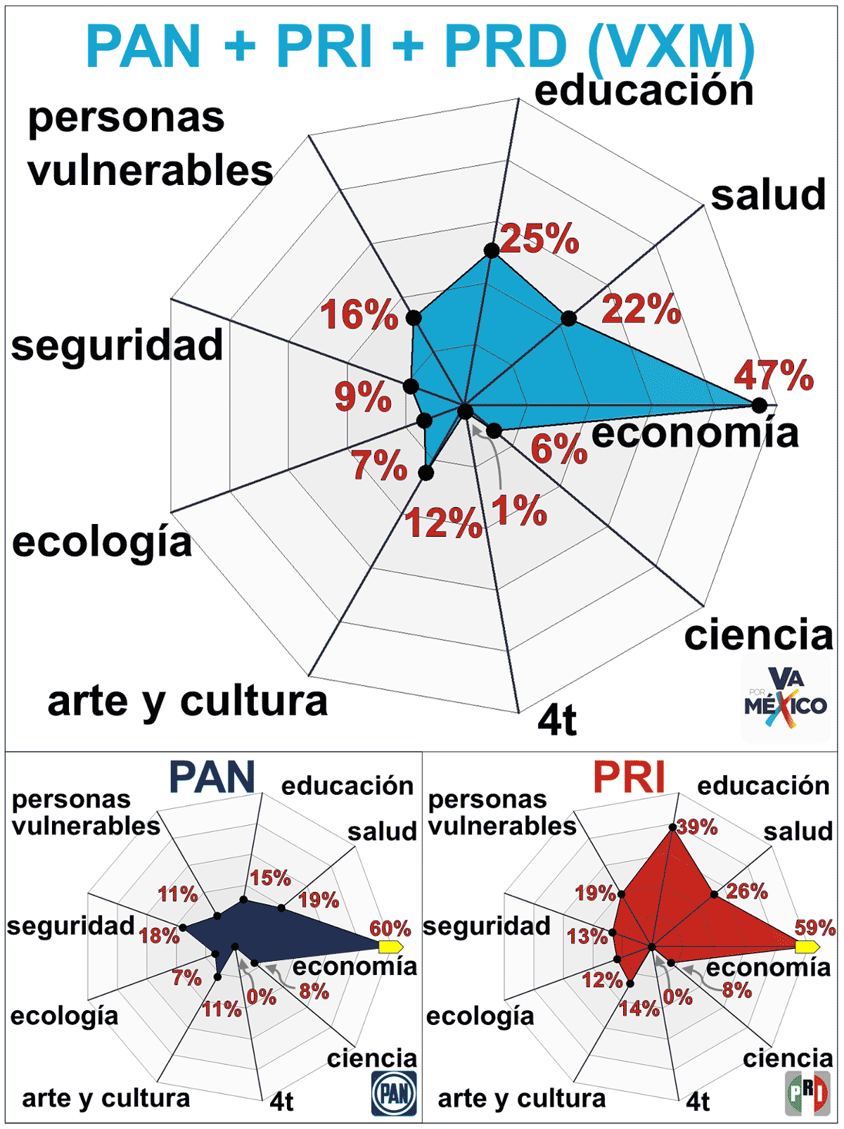Por otro lado, la coalición Va Por México (PAN, PRI y PRD) rara vez menciona a la 4T, y cuando lo hace no es de manera positiva —por ejemplo, un candidato de Va Por México en la CDMX escribe: “exigiremos el regreso del Instituto Nacional del Emprendedor, Institución que eliminó la 4T”—. En cambio, mencionan a la economía y al empleo dentro de sus principales propuestas. Por ejemplo, 12 % de los candidatos de Morena hablan de la educación en sus propuestas, mientras que 25 % de los candidatos de Va Por México y 39 % de los candidatos del PRI hablan de educación.