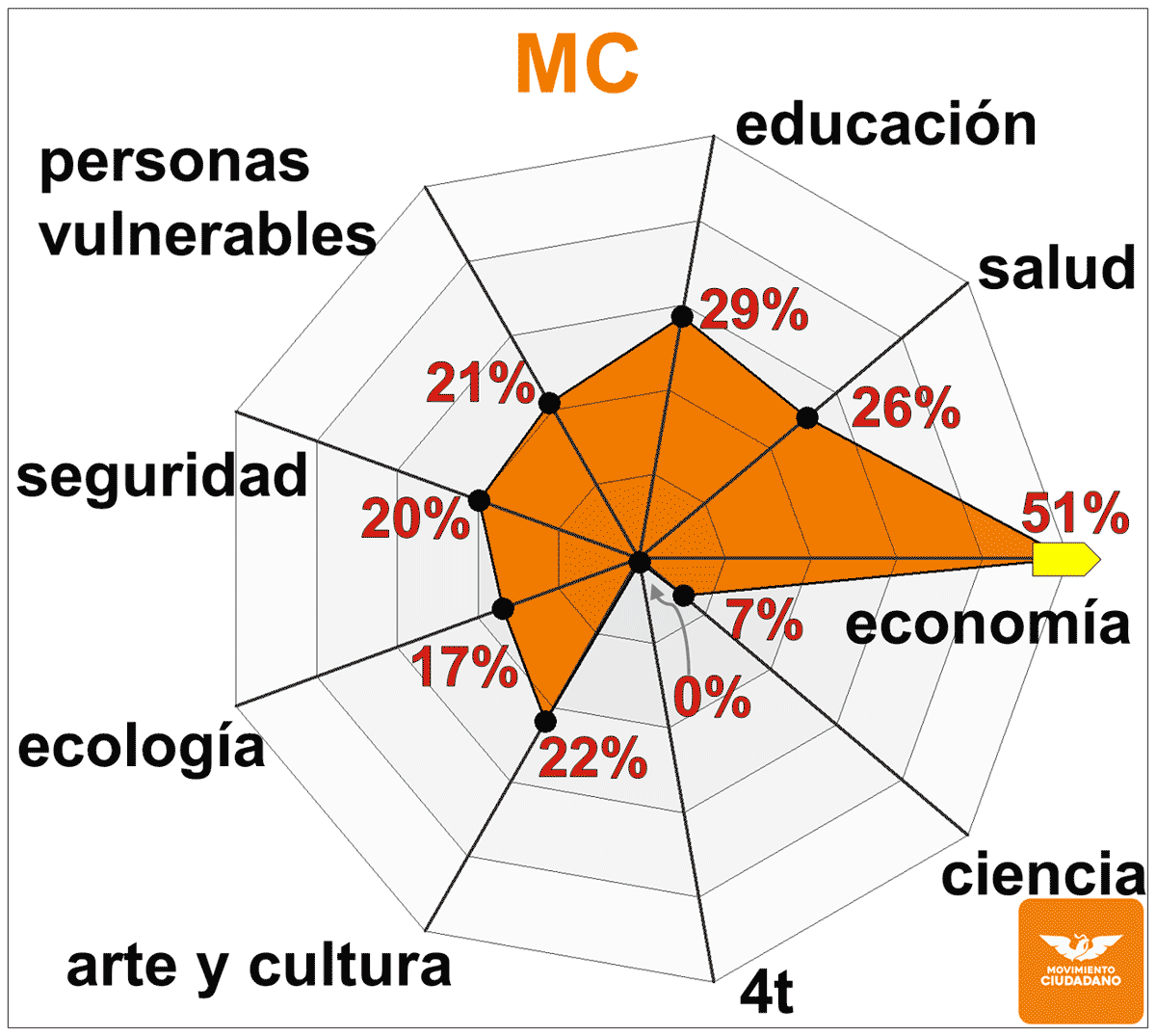 Movimiento Ciudadano, que busca posicionarse como una tercera opción, tiene una agenda legislativa distinta a otros partidos. Por ejemplo, 22 % de sus propuestas hablan de arte o de cultura, comparado con 14 % del PRI, 11 % del PAN y 8 % de Morena.