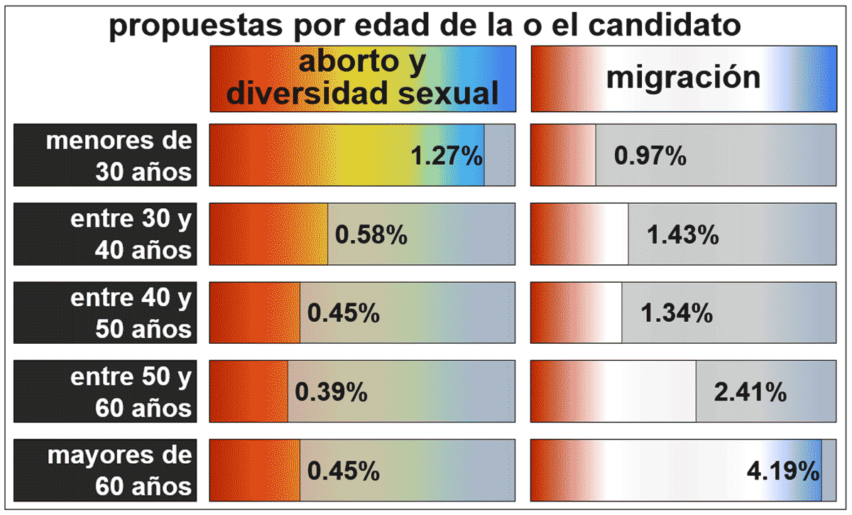 El partido no lo es todo. La edad de los aspirantes es muy relevante para entender mejor sus propuestas. Por ejemplo, casi 14 % de los candidatos menores de 30 años hablaron de ecología, sustentabilidad o del medio ambiente en sus propuestas frente a sólo 11 % de los candidatos mayores de 50 años. Los candidatos más jóvenes tienen más presente al medio ambiente dentro de sus propuestas. Además, aunque no es un número muy alto, de los más de 1 300 candidatos menores de 30 años, 1.27 % mencionó algo sobre el aborto o sobre la comunidad LGBT+ dentro de sus propuestas; en cambio, de los casi 700 candidatos mayores de 60 años, sólo 0.45 % generó propuestas en esa vertiente. Está ocurriendo un reemplazo generacional en la Cámara de Diputados: las tres candidatas más jóvenes nacieron después del ataque a las Torres Gemelas. Y, por supuesto, la edad refleja otros intereses. A los candidatos de mayor edad les tocó vivir el éxodo mexicano, cuando casi 800 000 mexicanos cruzaban la frontera cada año a finales de los 90; eso se ve reflejado en sus propuestas, que mencionan más frecuentemente a la migración.