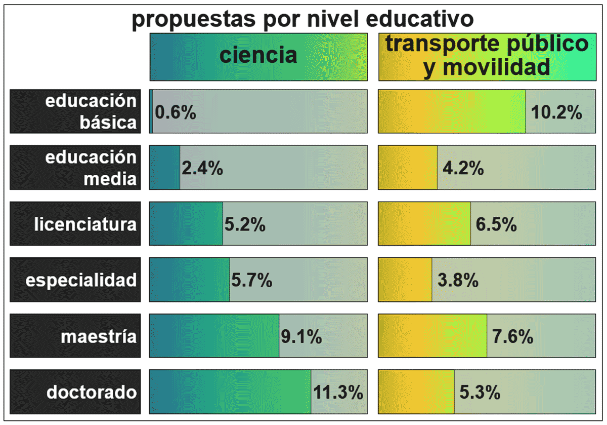 Figura 8. Propuestas que hablan de ciencia del lado izquierdo y de movilidad y transporte público, del lado derecho, según el nivel educativo del candidato.