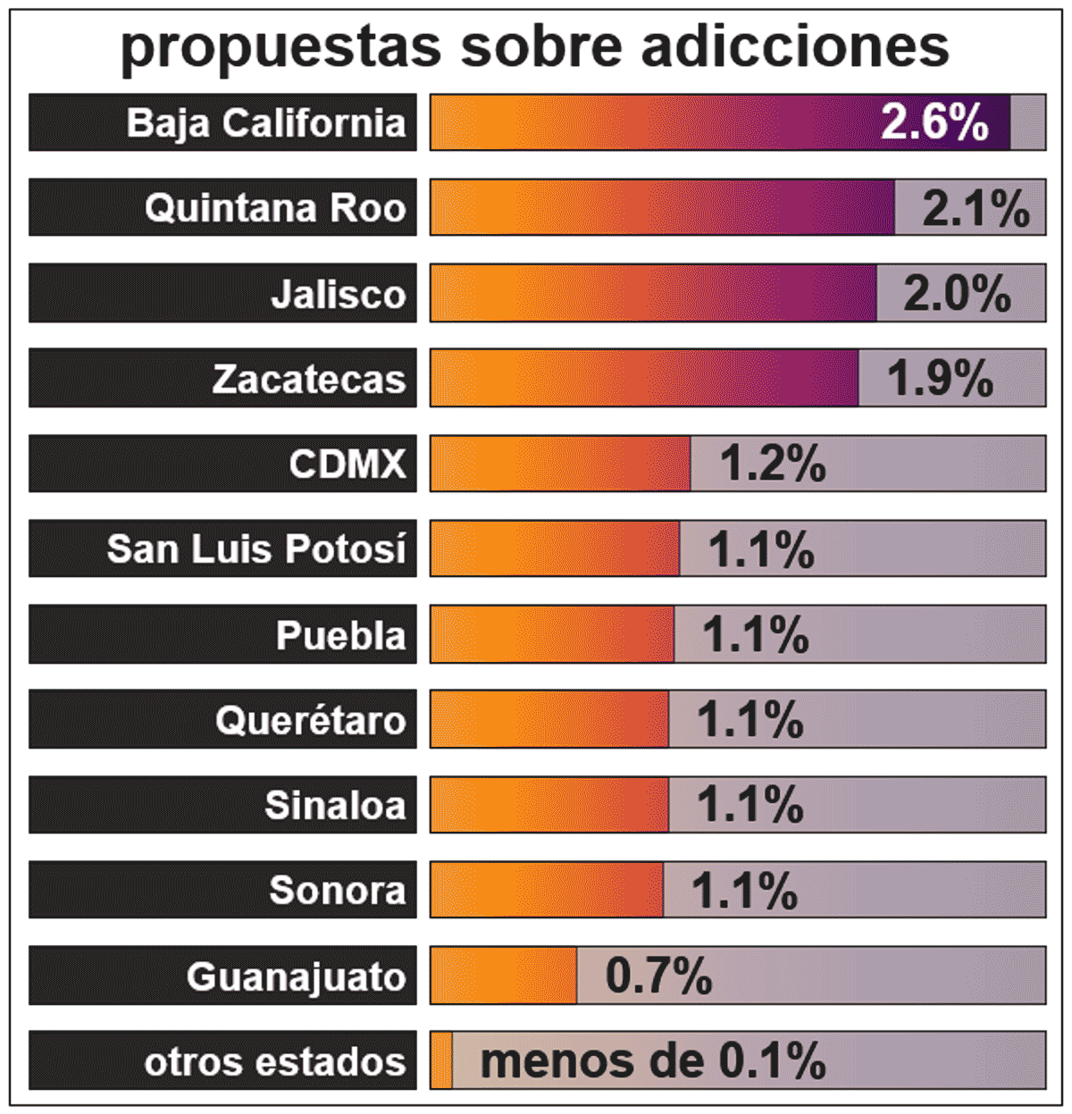 La seguridad es un tema recurrente en las propuestas de 2021. En estados muy inseguros —como Morelos, la CDMX o Colima— más del 20 % de las y los candidatos hablan sobre la inseguridad en sus propuestas; en estados más seguros, como Yucatán, sólo 3 % de las propuestas hablan sobre seguridad y acceso a la justicia. Hasta cierto punto las propuestas de cada entidad son reflejo de las problemáticas que ahí se sufren. En Tijuana y algunas otras ciudades fronterizas, por ejemplo, se ha detectado un serio problema de adicciones y de consumo de drogas inyectables y las y los candidatos de Baja California son los que más hablan sobre adicciones en sus propuestas, seguidos por los de Quintana Roo y Jalisco.