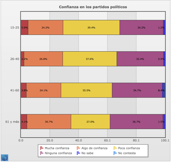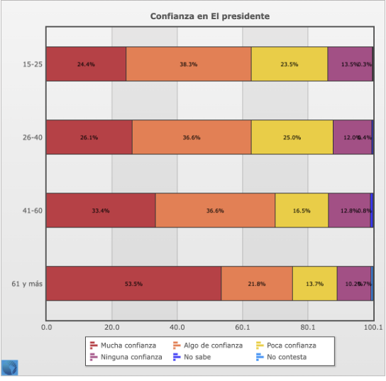 En cuanto a la confianza institucional, según datos de ese mismo año, la confianza en el presidente –la cual, por cierto, Ríos omite deliberadamente– es más del doble en el segmento de 61 y más con respecto al de 15-25, con un 53.5 % y un 24.4 % respectivamente (Ver gráfica 3).
