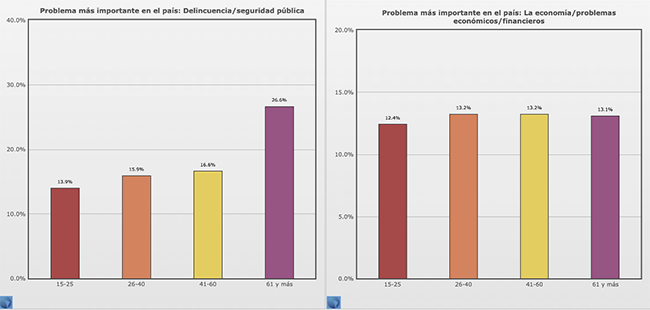 Como puede observarse en ambas gráficas, la preocupación por la inseguridad es homogénea en el sector poblacional que va desde los 15 hasta los 60 años, teniendo un despunte significativo del 16.6 % al 26.6 % en personas mayores de 61 años. En cuanto a la inquietud que generan los problemas económicos, hay unanimidad en los cuatro grupos, con un promedio del 13 %.