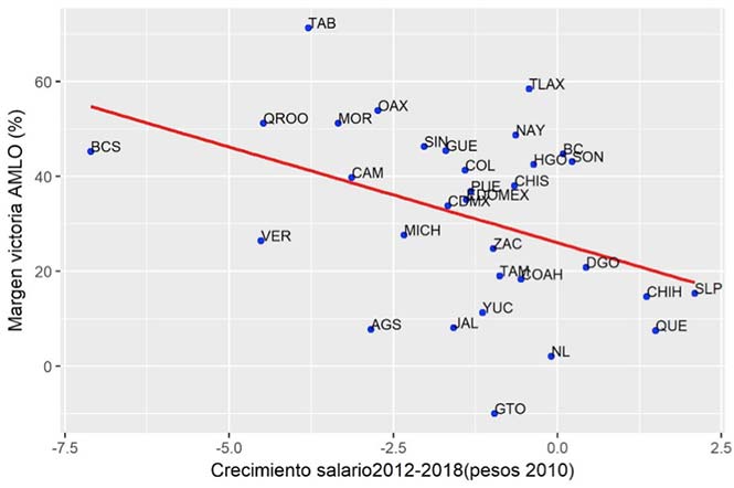 Gráfico 1: Relación entre niveles de diferencia de AMLO y crecimiento del salario